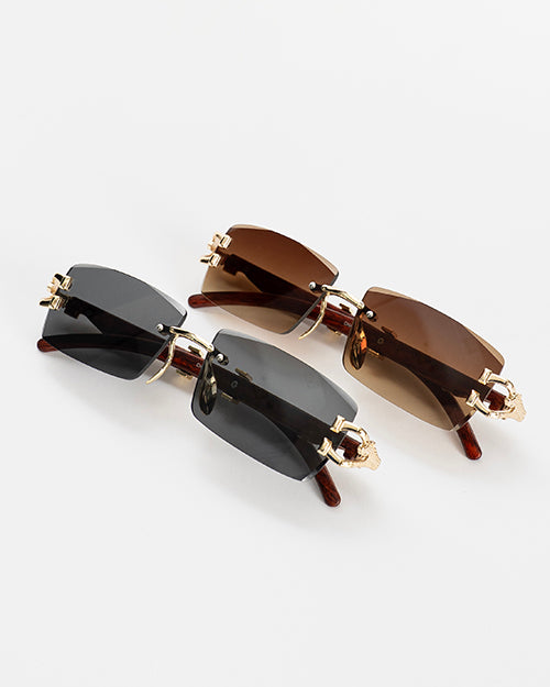 gafas sin marco, patas con efecto madera, lente en vidrio